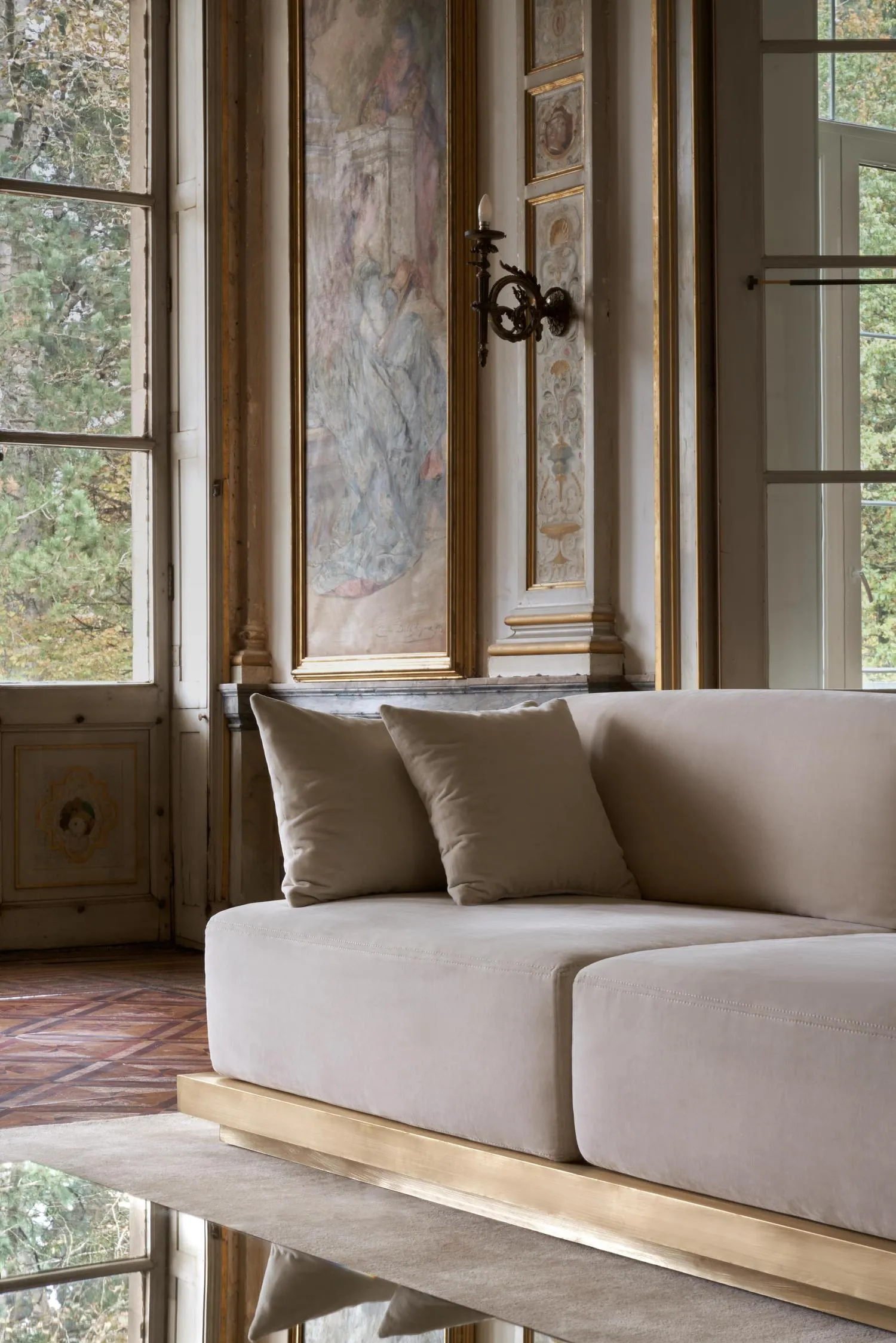 In deze indrukwekkende woning mochten wij de kussens realiseren voor een zetel op een prachtige metalen basis. De combinatie van statige basis en de op maat kussens geeft het meubelstuk een karaktervolle uitstraling, perfect passend bij de statige sfeer van het kasteelachtige interieur.