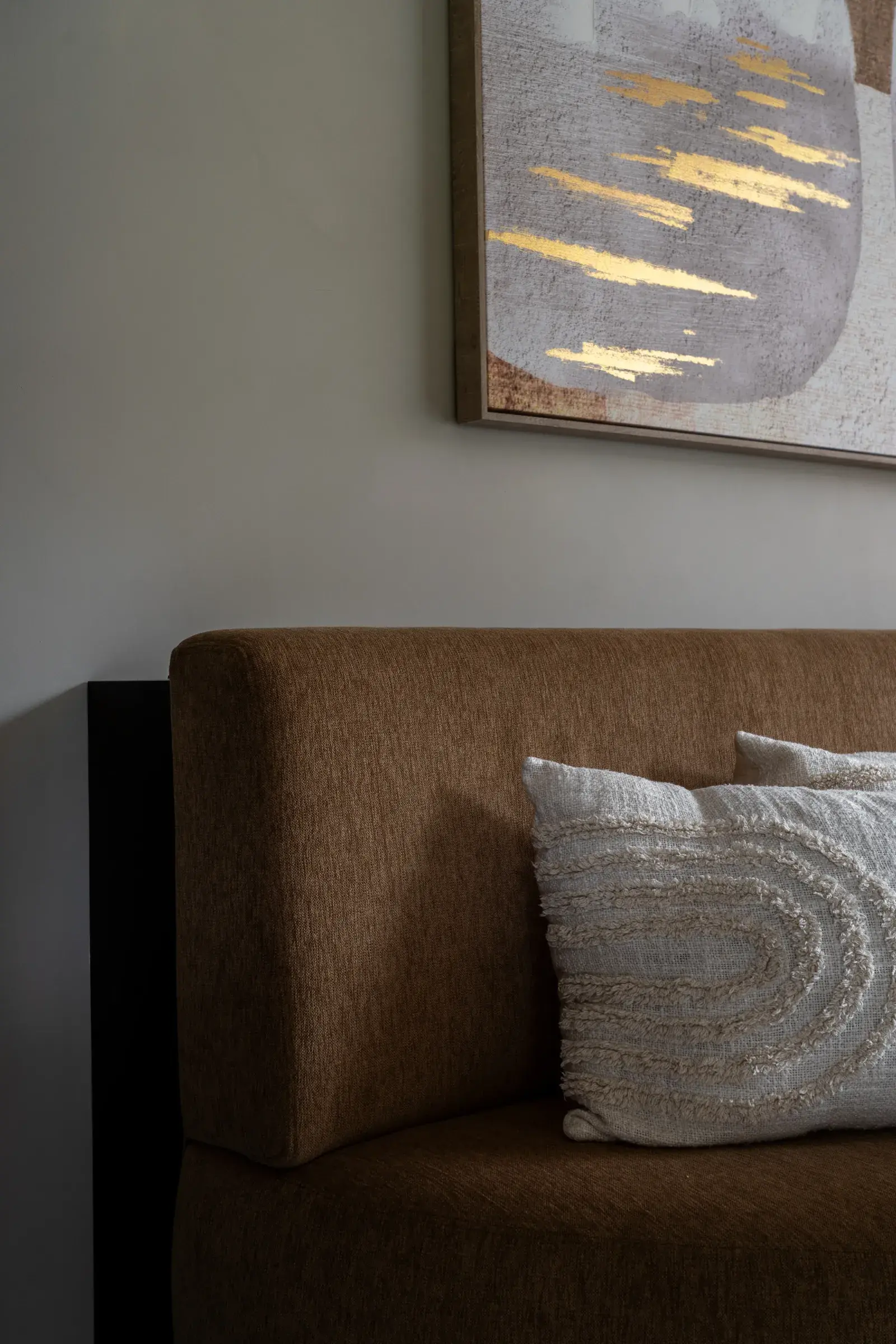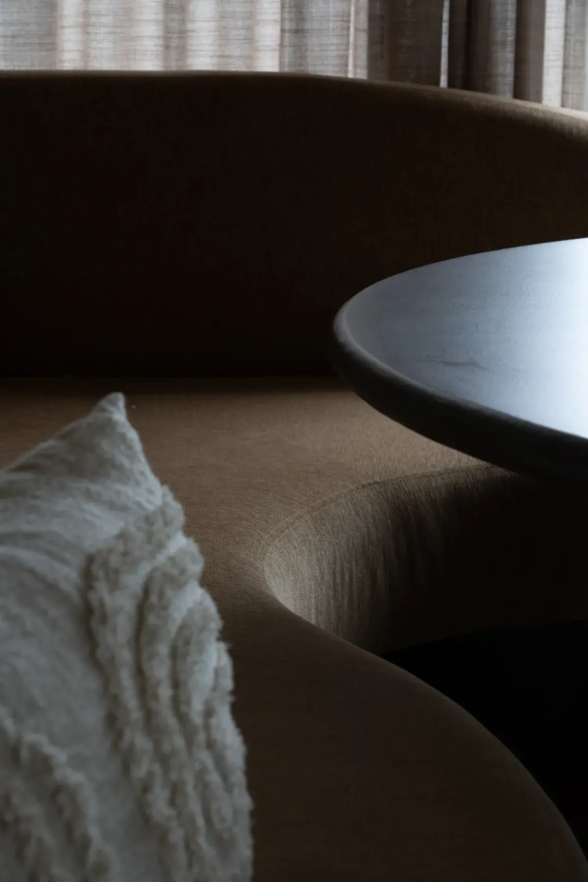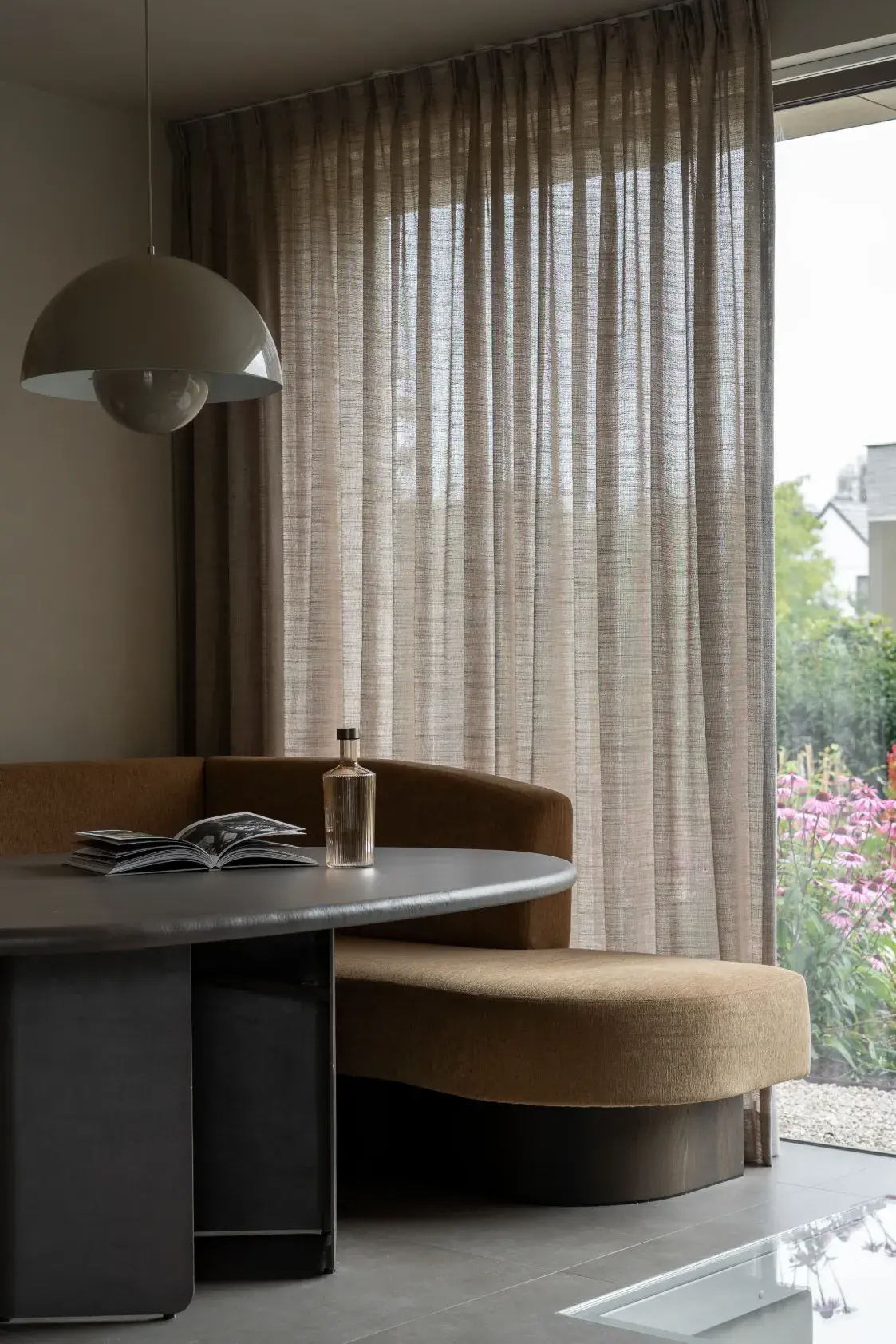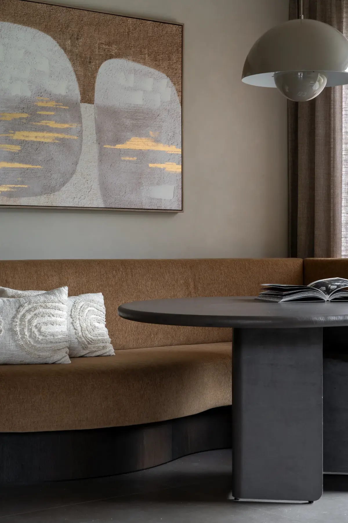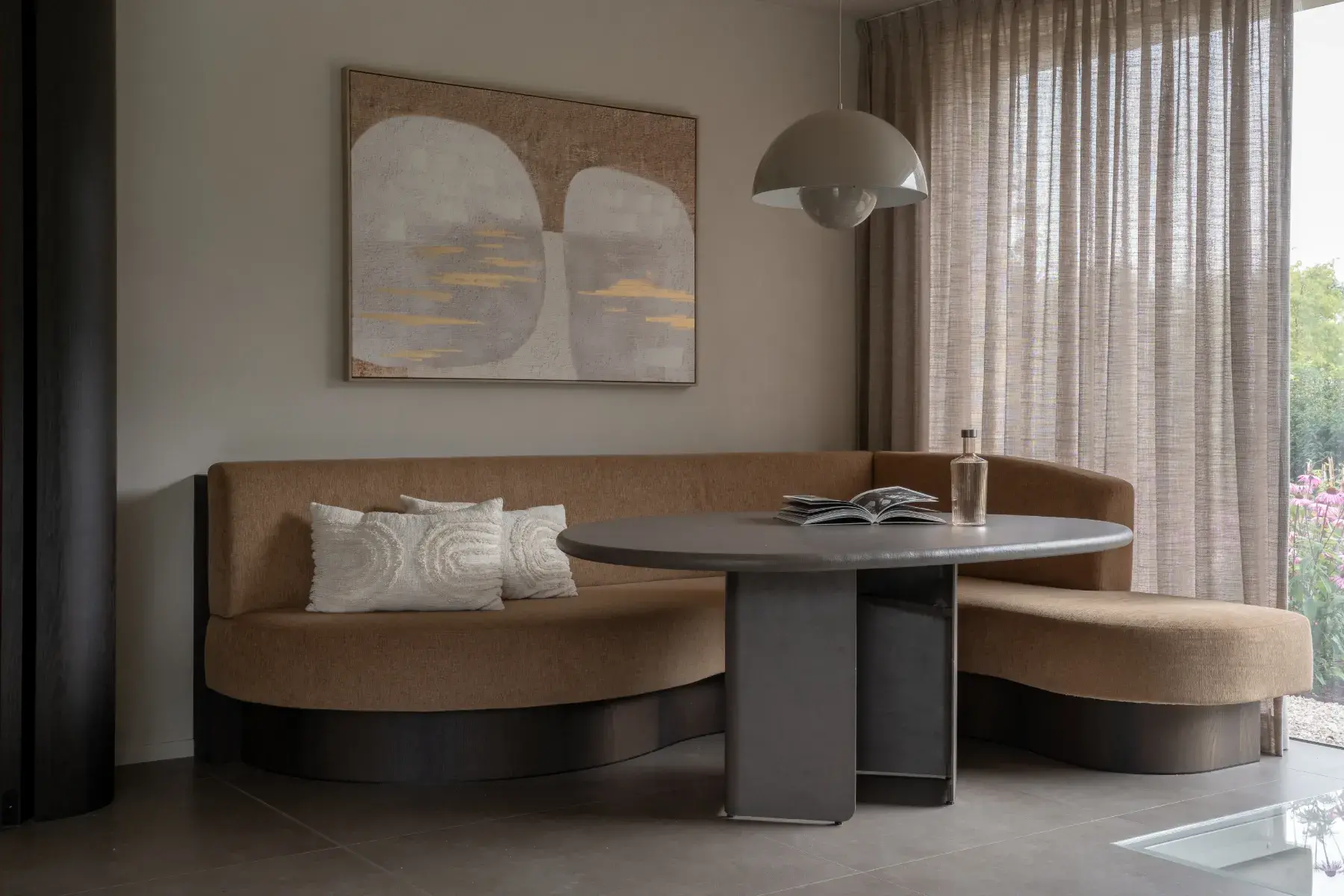 In deze prachtige keukenhoek hebben we een comfortabele en elegante zitbank op maat gecreëerd. De keuze viel op een warme bruine kleur, perfect passend bij de sfeer van de ruimte. De organische vorm van de bank voegt zachtheid en een uniek karakter toe, terwijl het comfort centraal blijft staan.