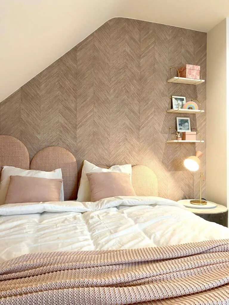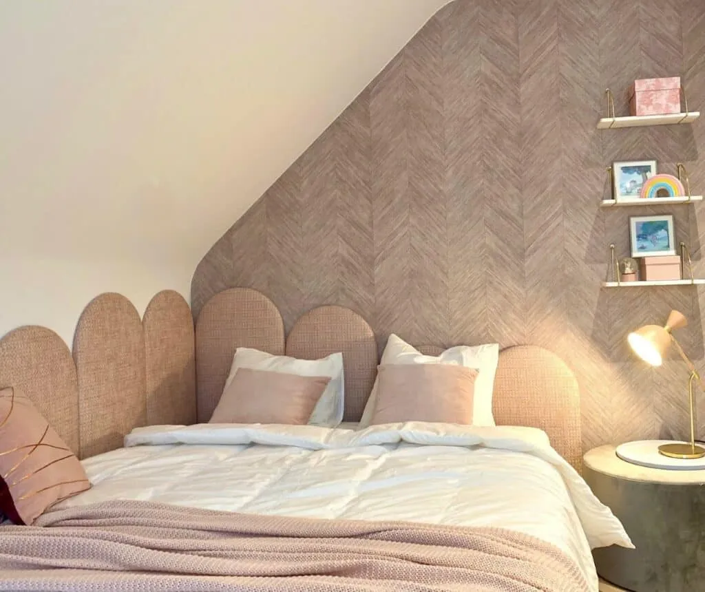 In deze meisjeskamer creëerden we een zacht en warm geheel met prachtig gestoffeerde wanden in een delicate roze tint. De bekleding zorgt niet alleen voor een knus en comfortabel gevoel, maar geeft de ruimte ook een vleugje elegantie en dromerigheid.