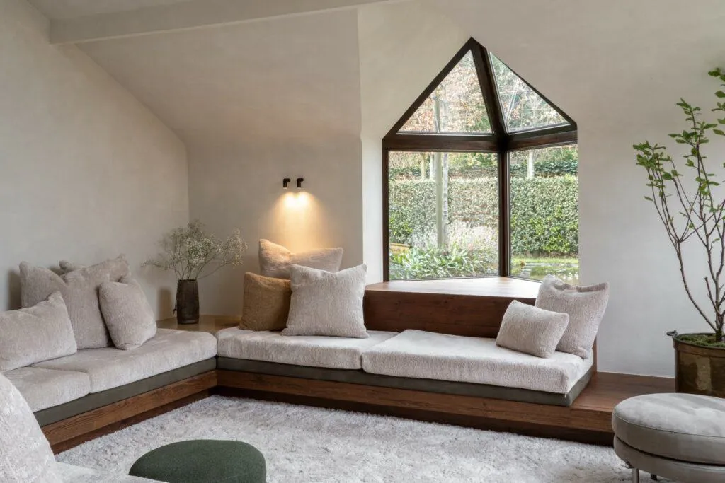 Voor dit project creëerden we op maat gemaakte kussens die perfect passen bij de strakke lijnen van de zetel. De keuze voor een rijkelijk dikke stof voegt een warme en uitnodigende uitstraling toe, waardoor het geheel niet alleen stijlvol maar ook uiterst comfortabel is.