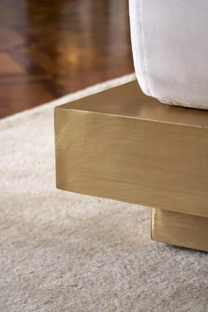 In deze indrukwekkende woning mochten wij de kussens realiseren voor een zetel op een prachtige metalen basis. De combinatie van statige basis en de op maat kussens geeft het meubelstuk een karaktervolle uitstraling, perfect passend bij de statige sfeer van het kasteelachtige interieur.