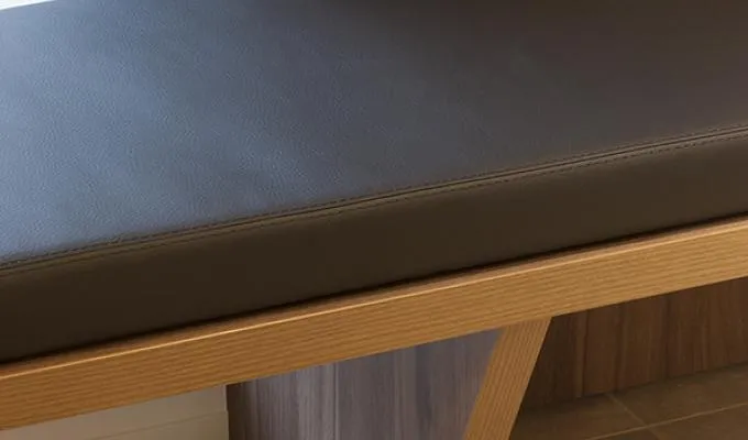 Voor praktijken en wachtkamers worden we vaak bevraagd kussens of wachtmeubilair te maken. De uitvoering gebeurt meestal in hoogwaardig kunstleder, dat zeer onderhoudsvriendelijk is en vaak een healthcare of sanitized label heeft, zodat het ook afwasbaar is met desinfecterende producten. Technische fiches worden steeds voorzien in verband met de onderhoudsvoorschriften. In deze praktijk had de schrijnwerker de legplanken voorzien en maakten we de kussens op maat in zwart kunstleder.