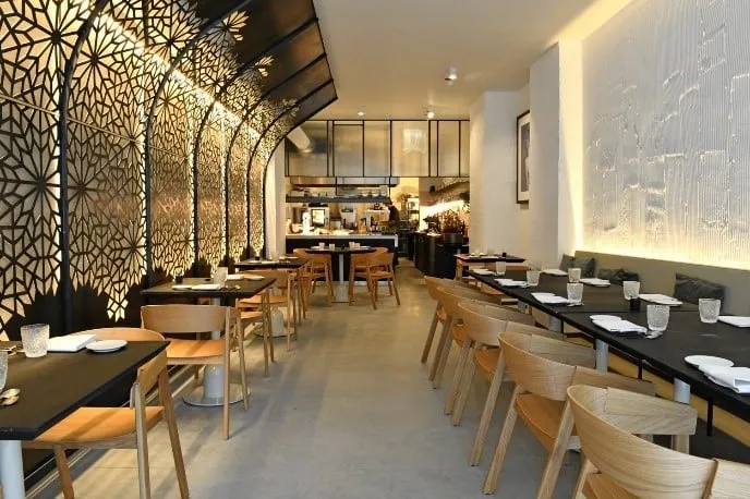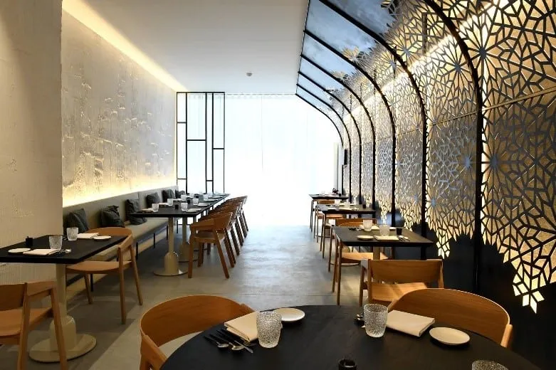Wij maakten de prachtige akoustische wanden in dit restaurant, volgens design van Frederic Van Dooren.