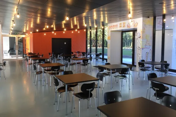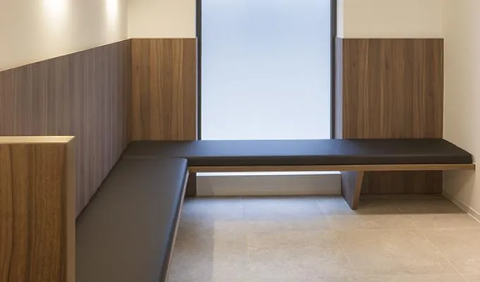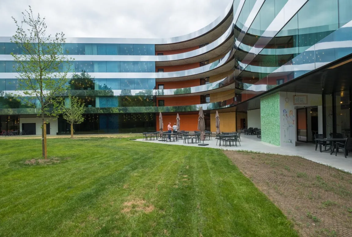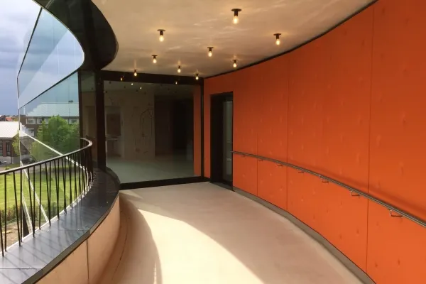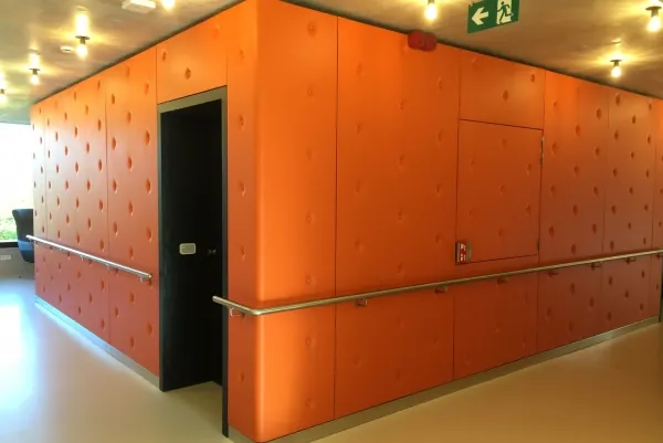 Aan de binnenzijde van het gebouw werden ook gestoffeerde panelen aangebracht, om de akoestiek in de gangen te verbeteren. Hiervoor gebruikten we akoestisch schuim en kunstleder.